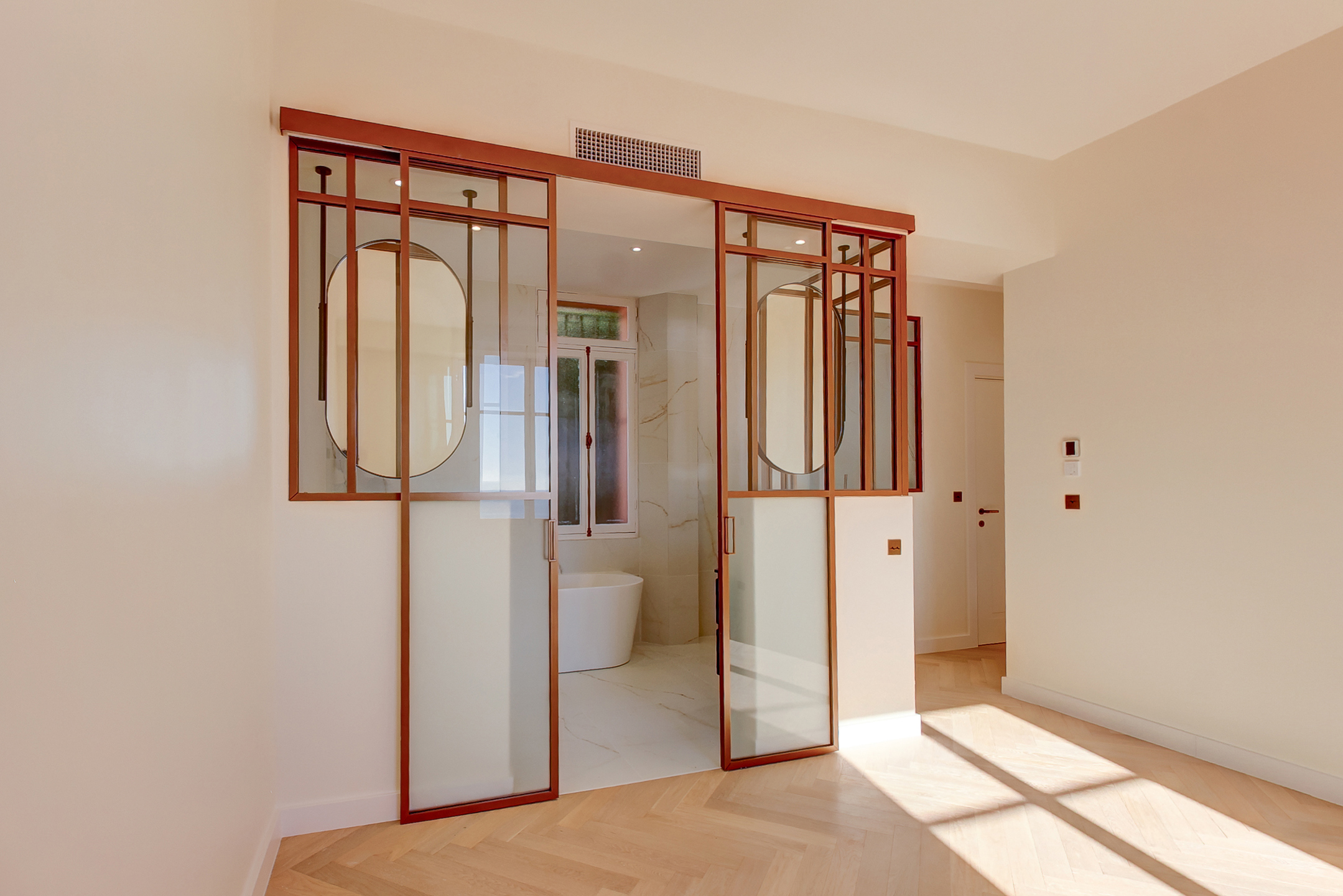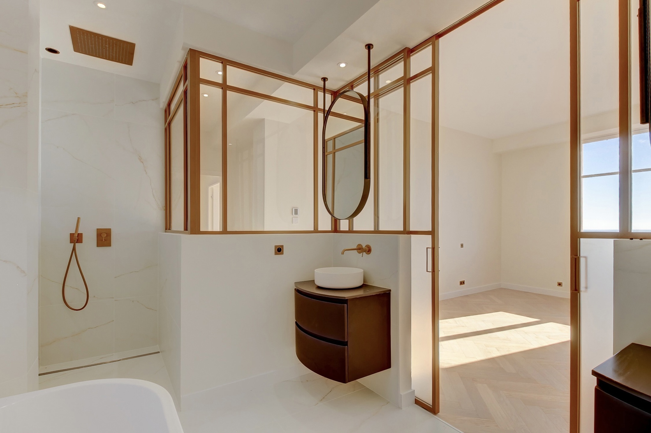 L’appartement dispose aujourd’hui de trois chambres configurées en suites avec salle d'eau dans chacune d'entre elles, la chambre parentale bénéficie en plus d'une baignoire.