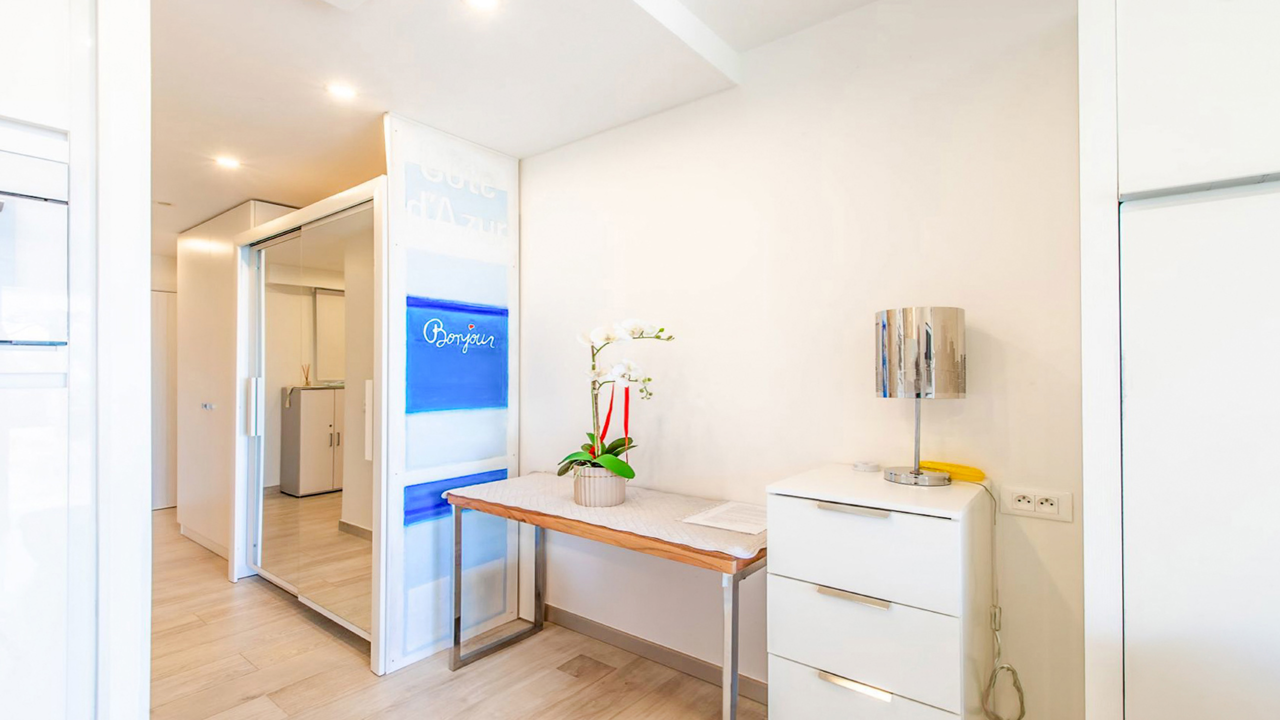 L’appartement, situé au 1er étage, se compose d’un bel espace de vie lumineux équipe d'un lit escamotable avec canapé intégré de qualité, d’une cuisine ouverte haut de gamme entièrement équipée, d’une salle d’eau moderne, ainsi que de nombreux rangements sur mesure. Une alcôve à l’entrée accueille un lit d’appoint.